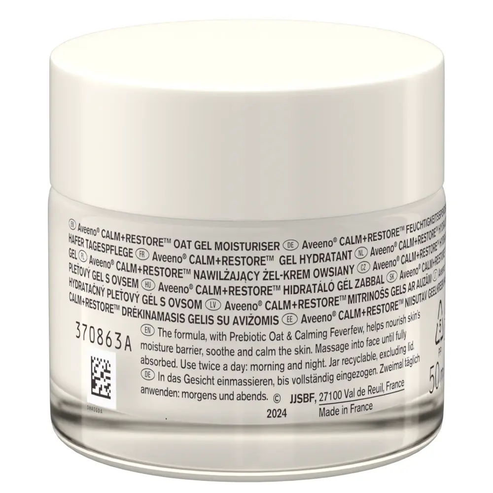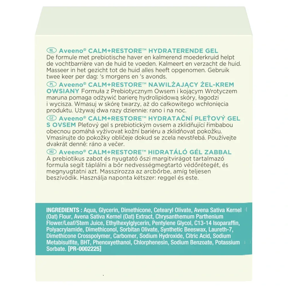 Aveeno® Face Calm+Restore™ Hydratační pleťový gel s ovsem poskytuje intenzivní hydrataci a okamžitě zklidňuje citlivou pokožku. Lehké, rychle se vstřebávající gelovo-krémové složení poskytuje intenzivní péči a zanechává citlivou pokožku hydratovanou a zklidněnou.